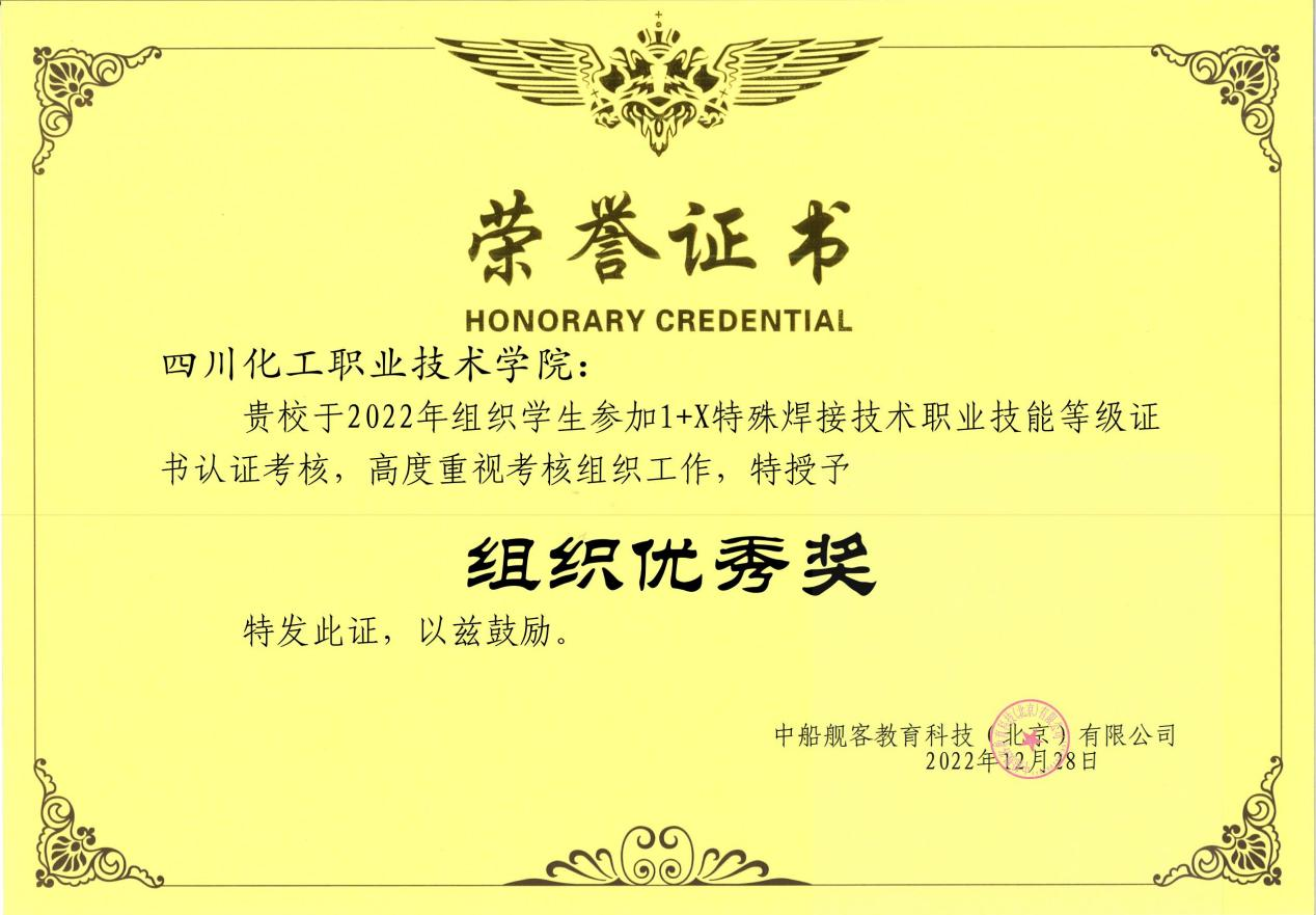 2022年12月28日中船舰客举办的2021~2022年特殊焊接技术职业技能等级证书试点工作表彰大会上,我院有幸荣获1+X特殊焊接技术职业技能等级证书试点院校组织优秀奖,张勇老师获得试点工作骨干教师奖,此次获奖是对我院1+X特殊焊接技术职业技能等级证书工作的高度认可,我院将再接再厉,再创佳绩,为职业教育的高质量发展作出绵薄贡献。