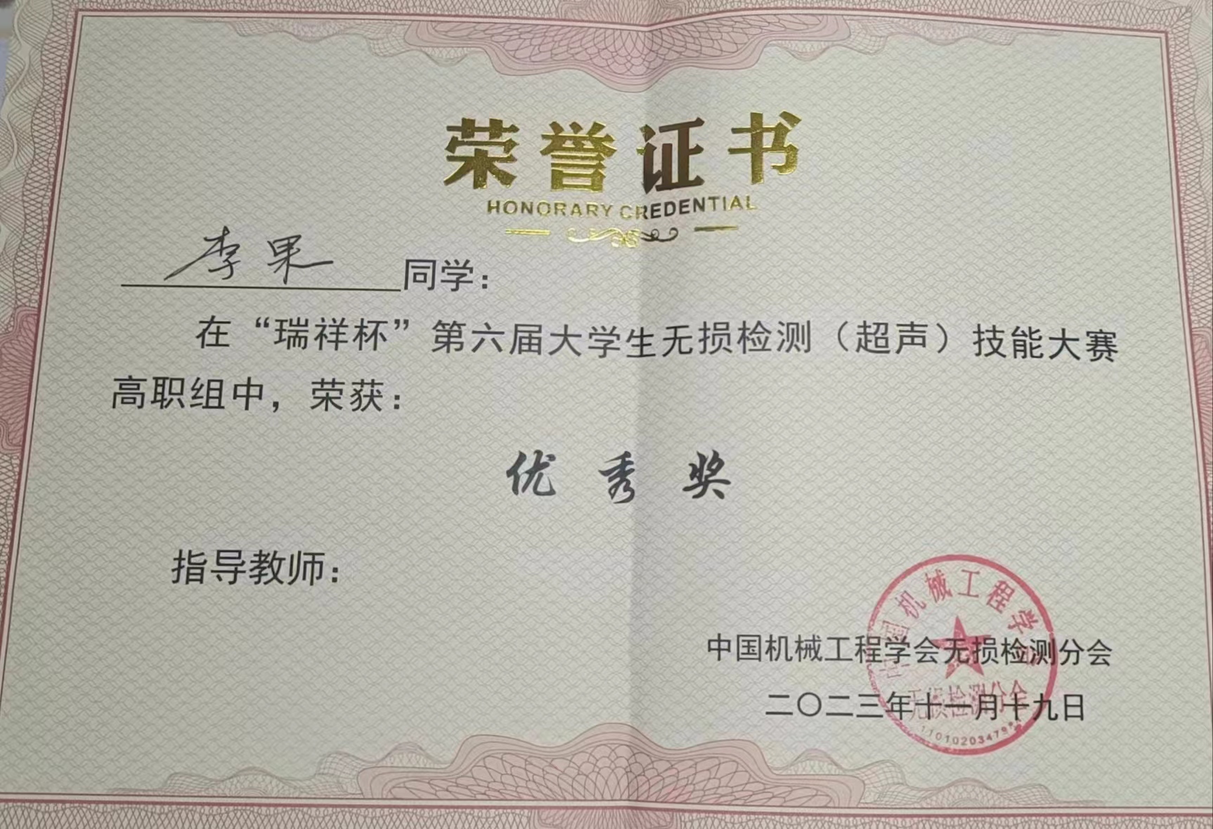 2023年11月17日至19日,第六届全国大学生无损检测(超声)技能大赛在西安工程大学成功举行,来自全国的33所本、专科院校111位学生选手同台竞技。经过激烈地角逐,由我学院王非森、周林军、陈星红等老师指导的3名同学取得了优异的成绩,其中,黄健同学荣获高职组三等奖,李果、邱文军同学获得优秀奖。
