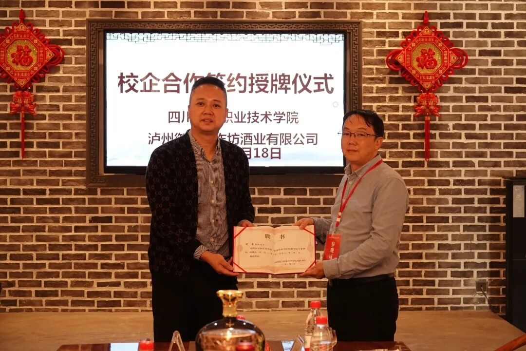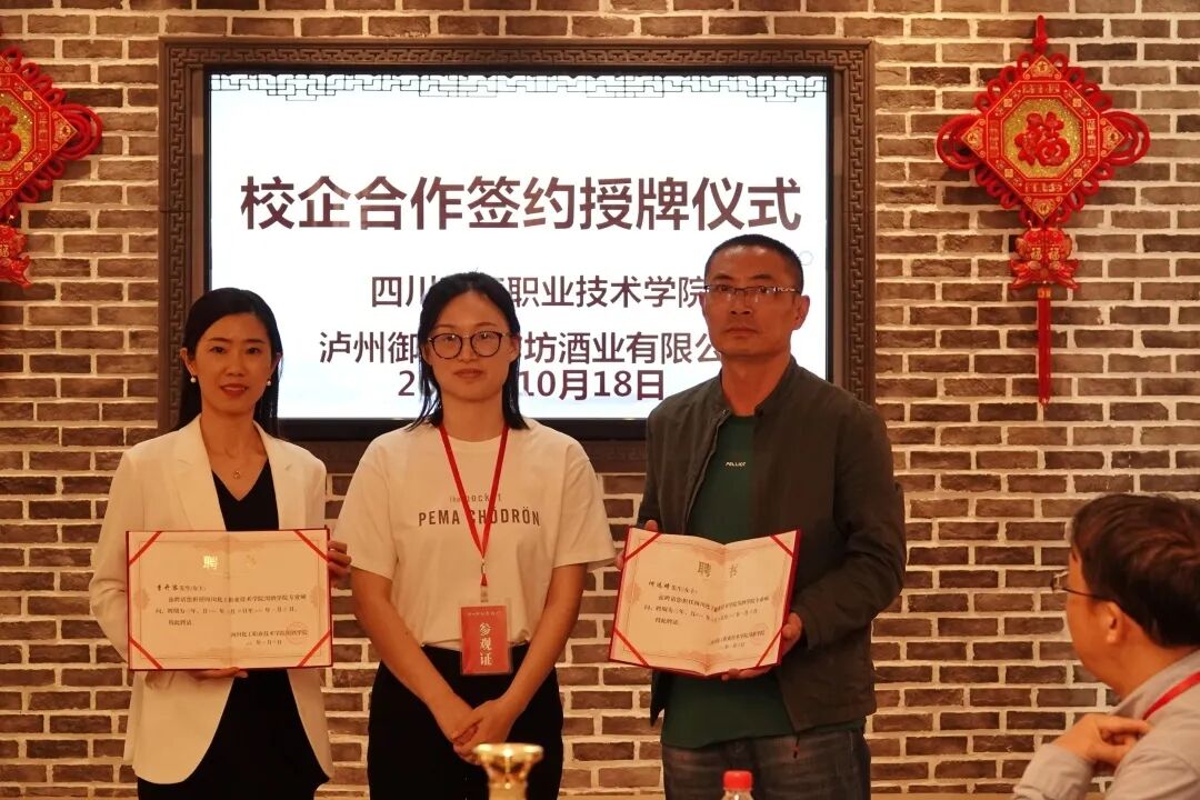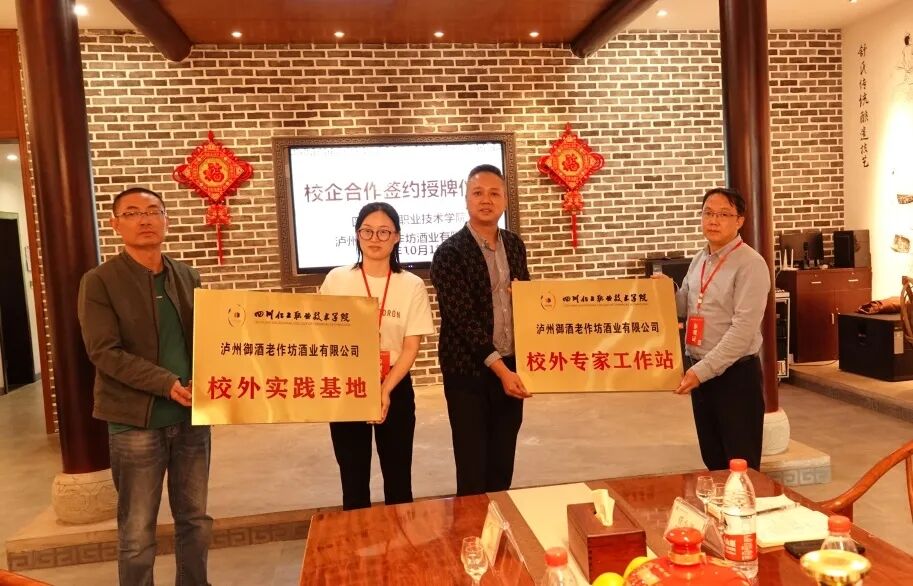 为进一步加强校企合作,促进产教融合,机械工程学院、川酒学院同泸州御酒老作坊有限公司(后称御酒公司)达成合作共识,于10月18日在御酒公司举行了校企合作签约授牌仪式。四川化工职业技术学院机械工程学院院长任小鸿、副院长陈玲、川酒学院教学科长康峻,御酒公司党支部书记李开容、总经理舒勇、技术负责人何远琦、办公室主任寇琳共同出席此次仪式。