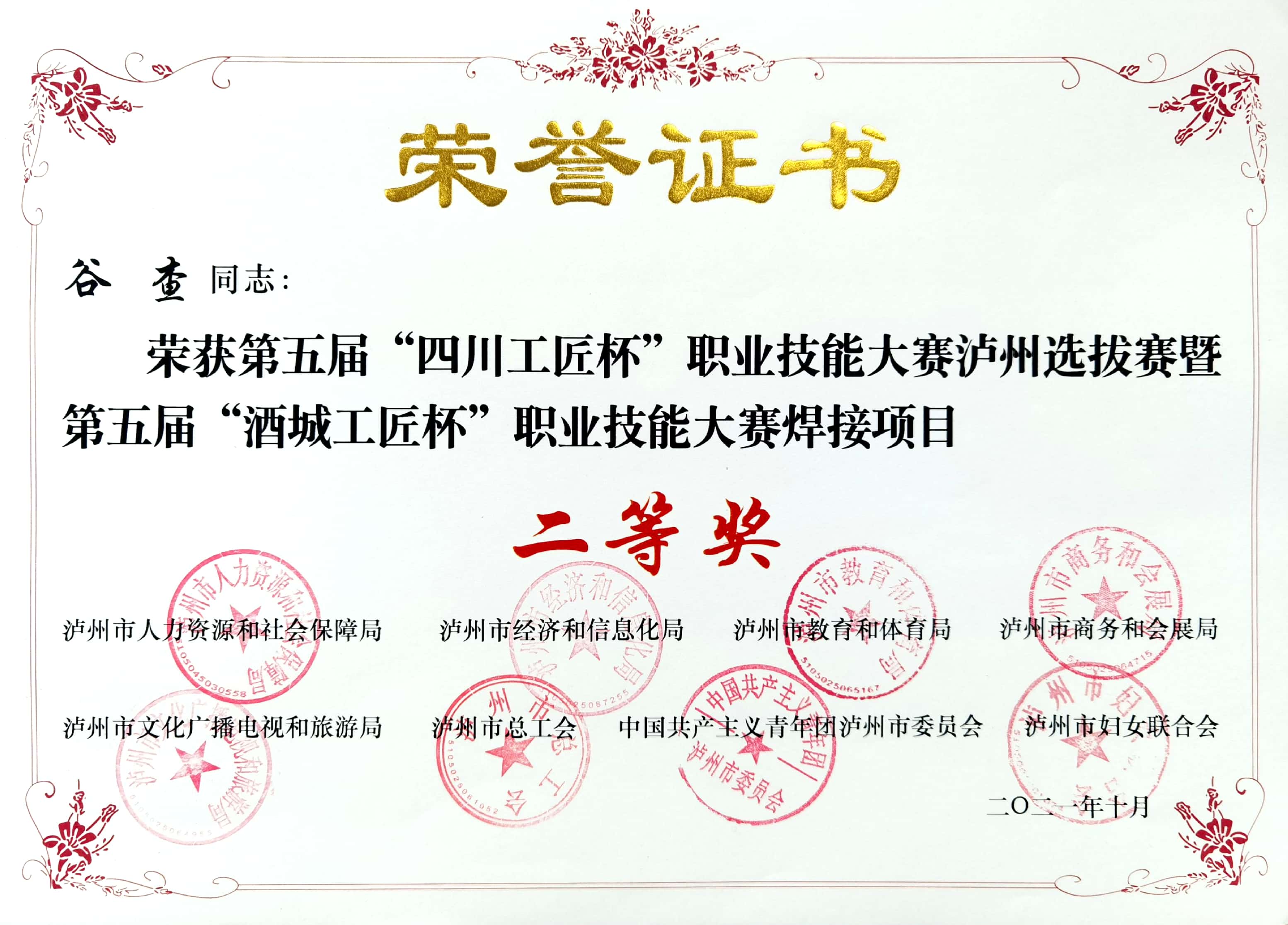 为弘扬工匠精神,提升学院学生技能水平,培养高素质技术技能人才,学院组织学生参加2021年泸州市第五届“酒城工匠杯”职业技能大赛,与来自企业能工巧匠同台竞技,经过激烈的比赛,焊接1931班学生谷查在焊接技能比赛中获得二等奖,焊接2031班学生梁承兴获得优胜奖,新能源1932班学生梁金平在汽车维修比赛中获得优胜奖。