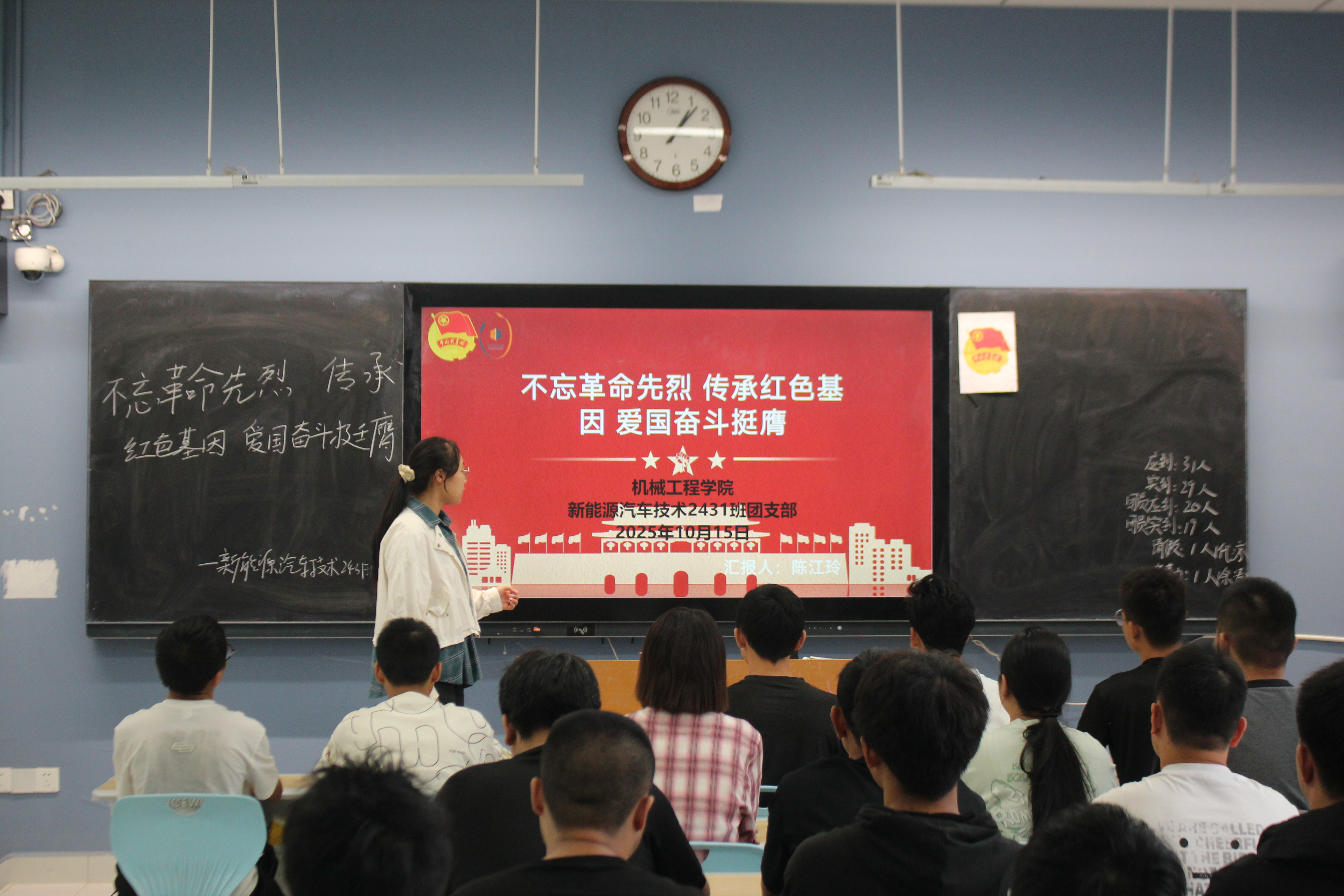 为深入贯彻落实爱国主义教育,引导广大青年学生铭记革命历史、传承红色基因,增强时代责任感与使命感。2025年10月15日,四川化工职业技术学院机械工程学院于博学楼8E组织各班级团支部开展 “不忘革命先烈,传承红色精神,爱国奋斗挺膺” 主题团课。旨在通过丰富多样的形式,让红色精神在青年学子心中落地生根,激励大家以实际行动践行爱国奋斗誓言。