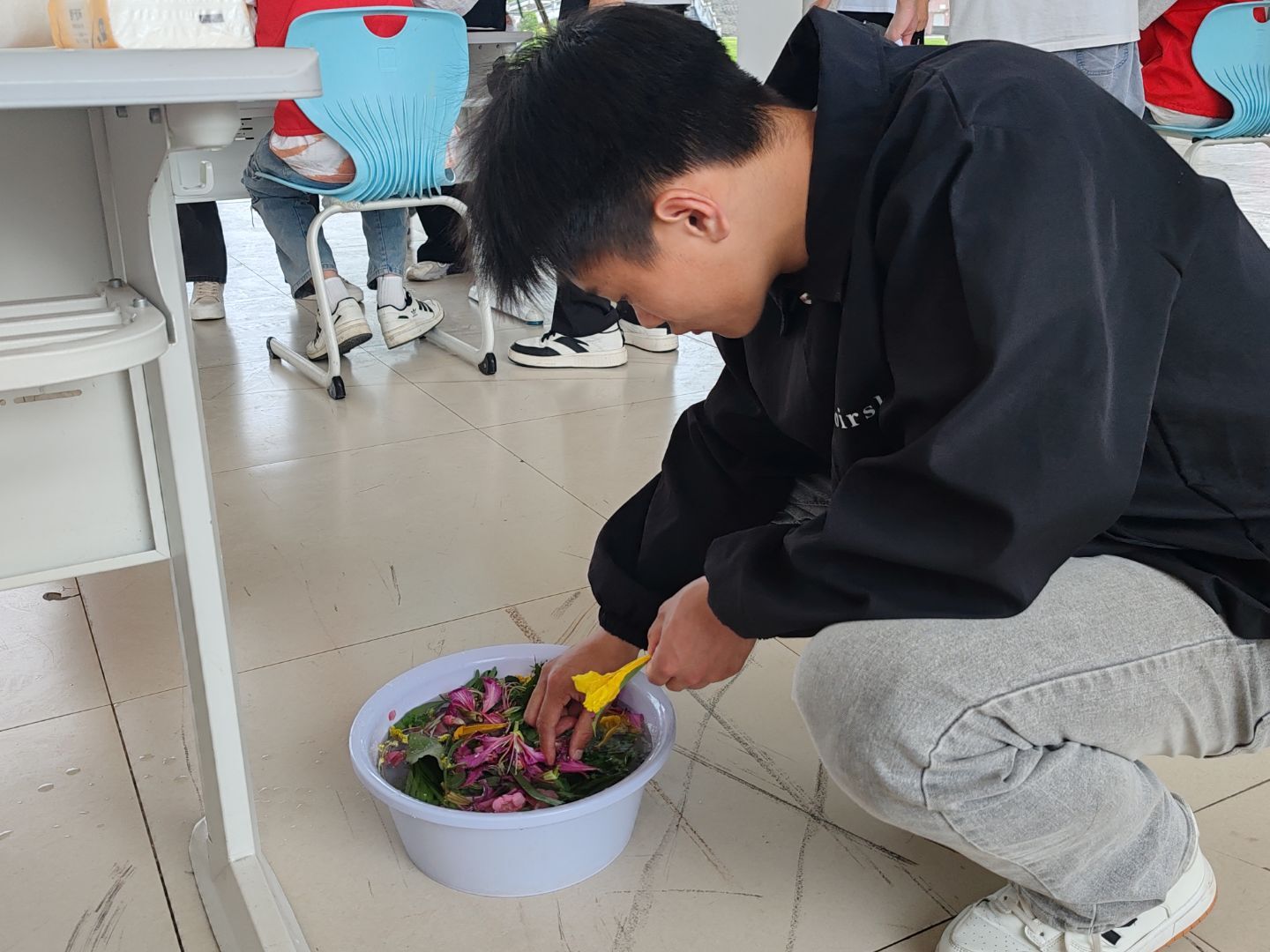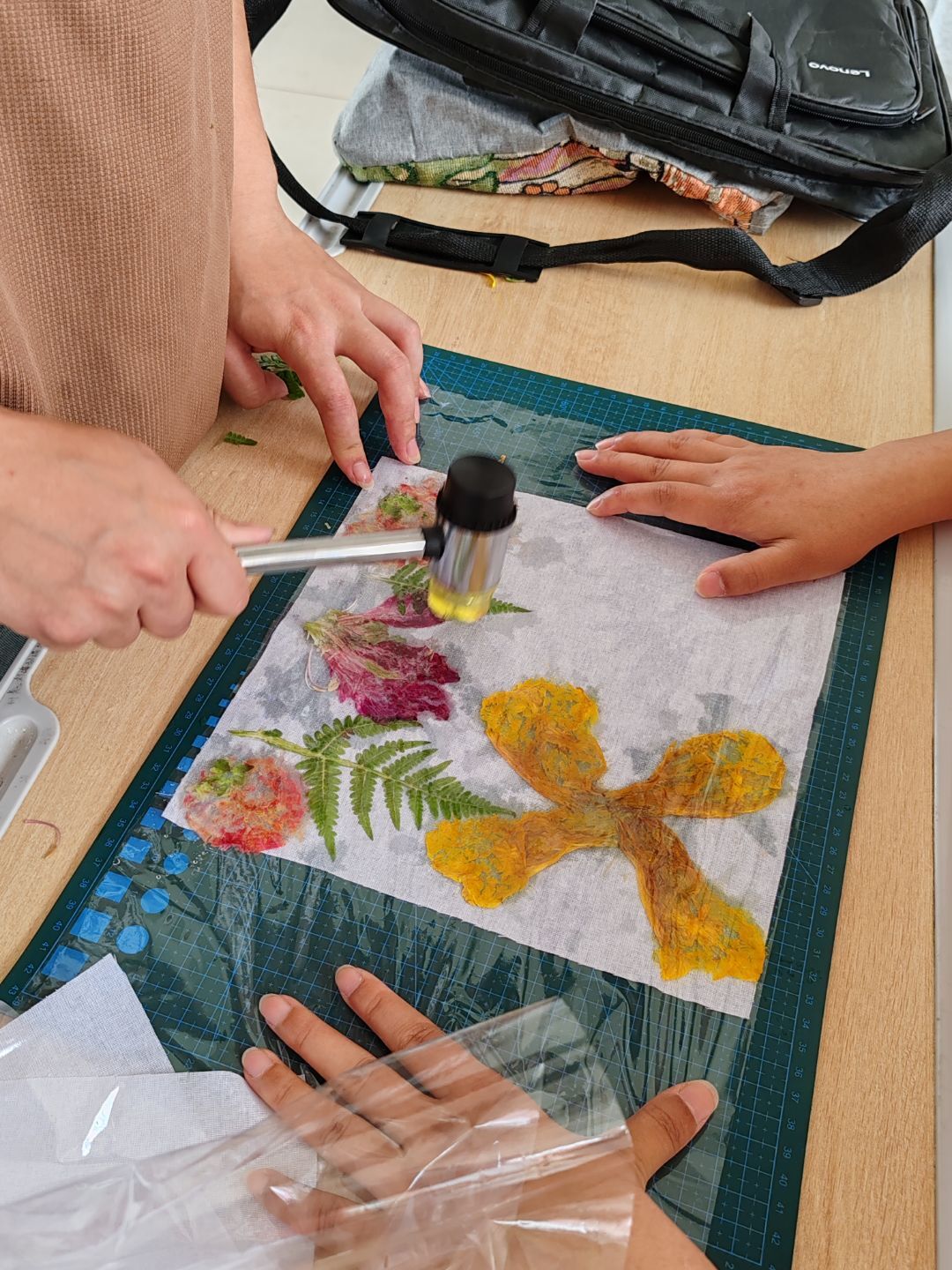 学生们全神贯注于素材的处理过程:部分学生精心剔除叶片的叶肉部分,仅保留网状叶脉,以此作为天然的“拓版”;另一些学生则将月季花瓣按照色彩的渐变顺序层叠摆放,为织物预先设定自然晕染效果的“画布”。