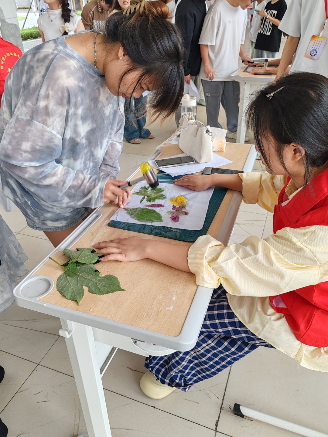 参与者凭签到记录依次领取扎染方巾、A3垫板及拓染工具包,主办方贴心为素材采集不足的学生准备了备用植物材料,枫叶、银杏、薄荷、月季等十余种新鲜草木整齐陈列,静待与织物“对话”。志愿者们现场拆解拓染技艺核心:从4500年前“草木染”的文献记载,到2006年入选国家级非遗名录的技艺脉络,再到叶脉筛选、锤印力度控制等实操要点,让承载着中华传统智慧的技艺从古籍走向掌心,成为触手可及的文化体验。