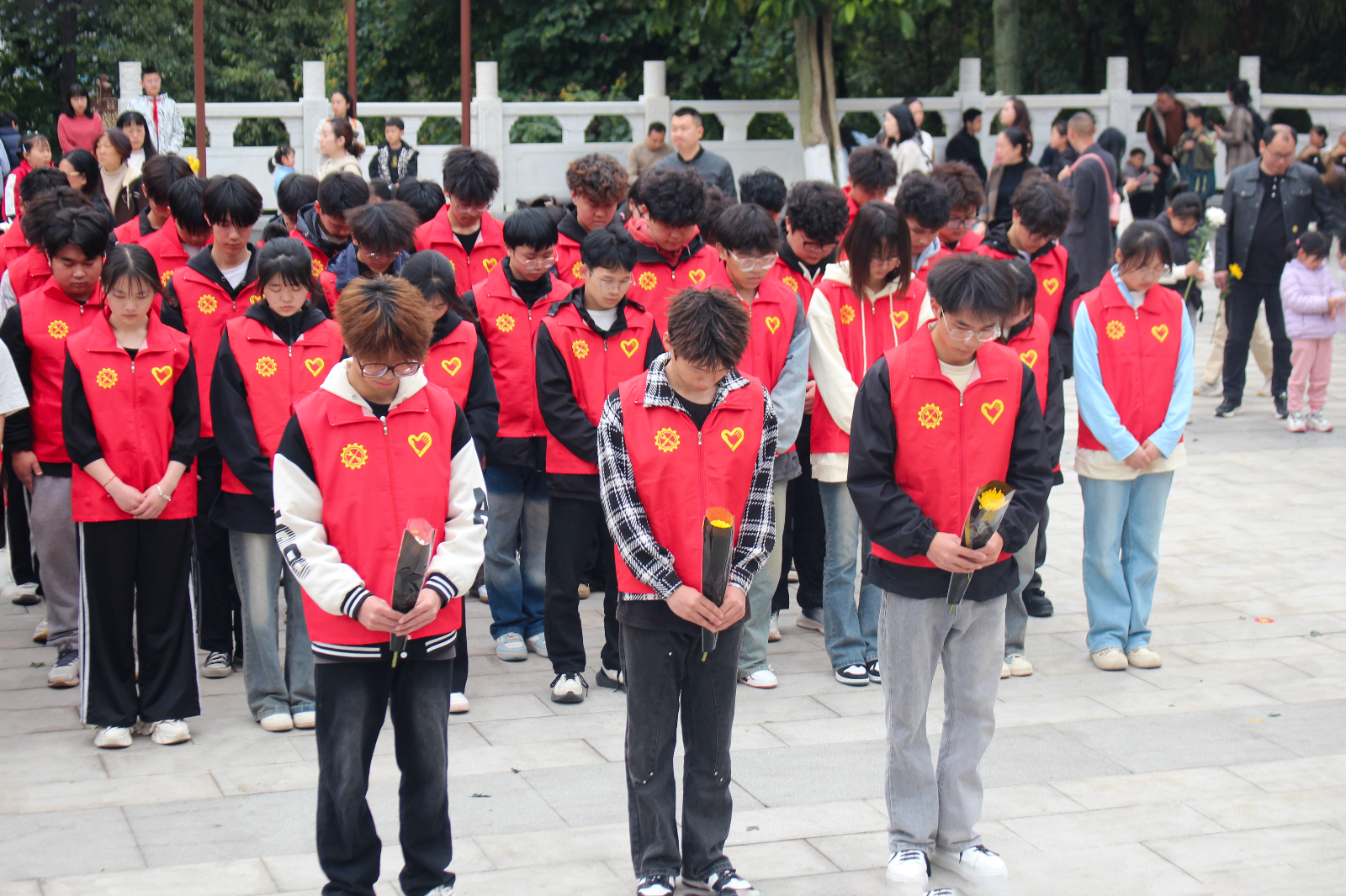 同学们怀着庄重的心情抵达烈士陵园。在烈士纪念碑前,全体人员整齐列队,现场气氛庄严肃穆。每位同学手持菊花、抹布,对英雄们的墓碑进行清扫及哀悼;随后,全体人员面向烈士纪念碑肃立,齐声高唱中华人民共和国国歌,激昂的旋律在陵园上空回荡,表达了对革命先烈的崇高敬意。国歌唱毕,现场进入默哀环节,全体人员低头默哀一分钟,用沉默寄托对革命先烈的深切哀思。这短暂的一分钟,是同学们对先烈们英勇事迹的缅怀,也是对那段波澜壮阔革命历史的铭记。