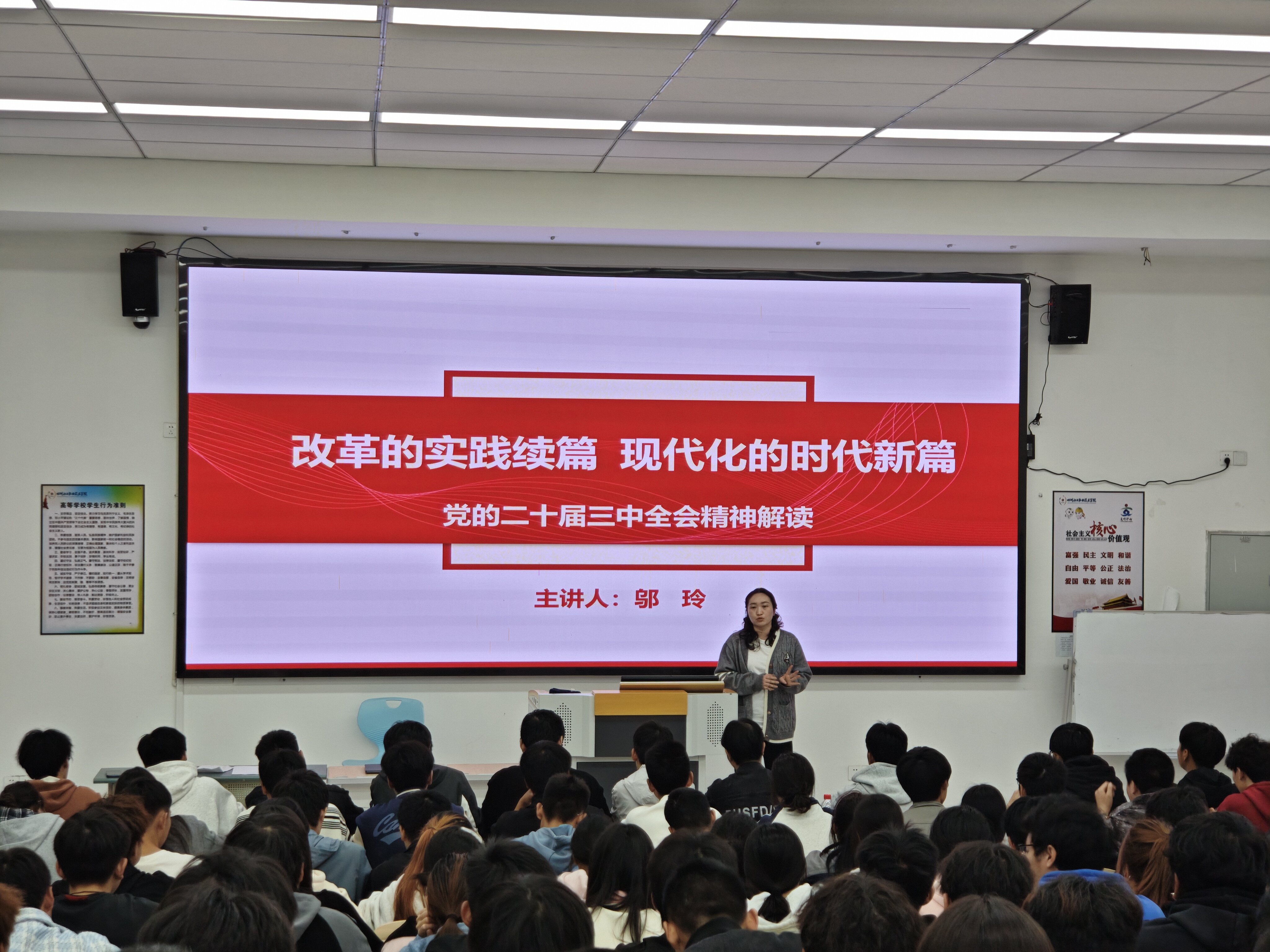 2024年11月15日,机械工程学院学生党支部开展了一场意义深刻的党课,主题为 “党课改革的实践续篇 现代化的时代新篇——党的二十届三中全会精神解读”,本次党课由邬玲主讲,机械工程学院大一全体学生参加。
