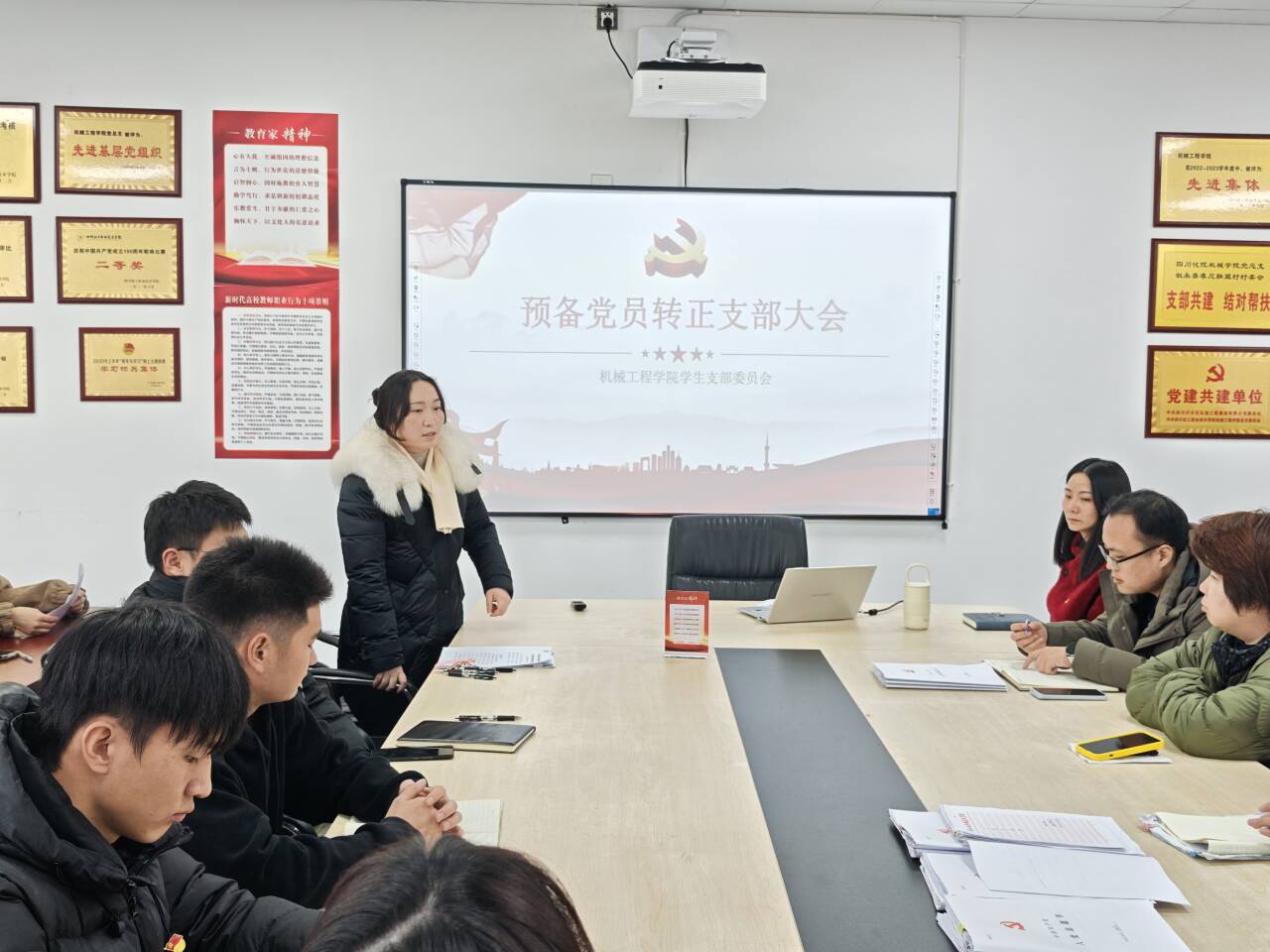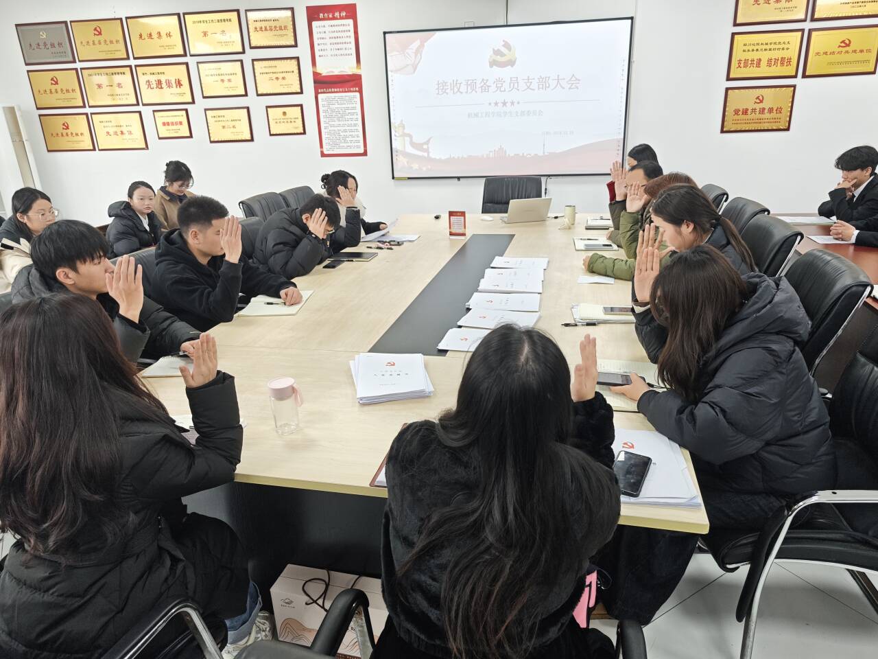 2024年12月19日,机械工程学院学生党支部在综合办公楼113召开党员大会,支部讨论接收中共预备党员相关事宜。本次会议由学生党支部书记邬玲主持,发展对象、预备党员和全体正式党员参加会议。