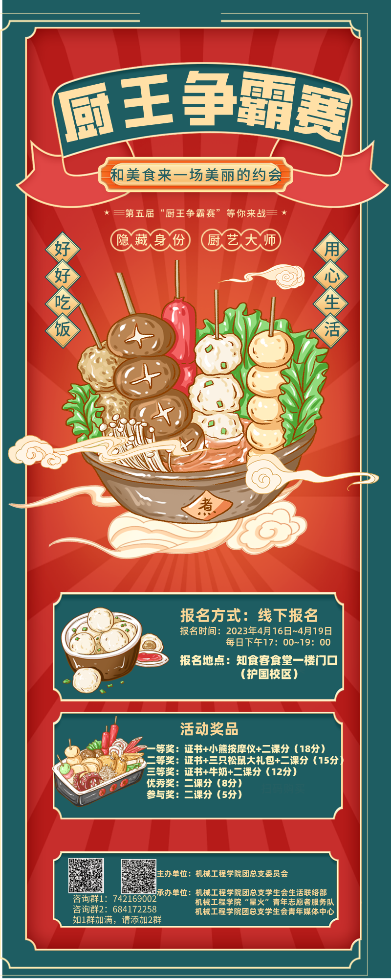 现在,机械工程学院团总支委员会面向学院全体学生特此展开“厨王争霸”烹饪活动。话不多说,大家赶紧报名参加活动和众多厨神们一争高下吧!