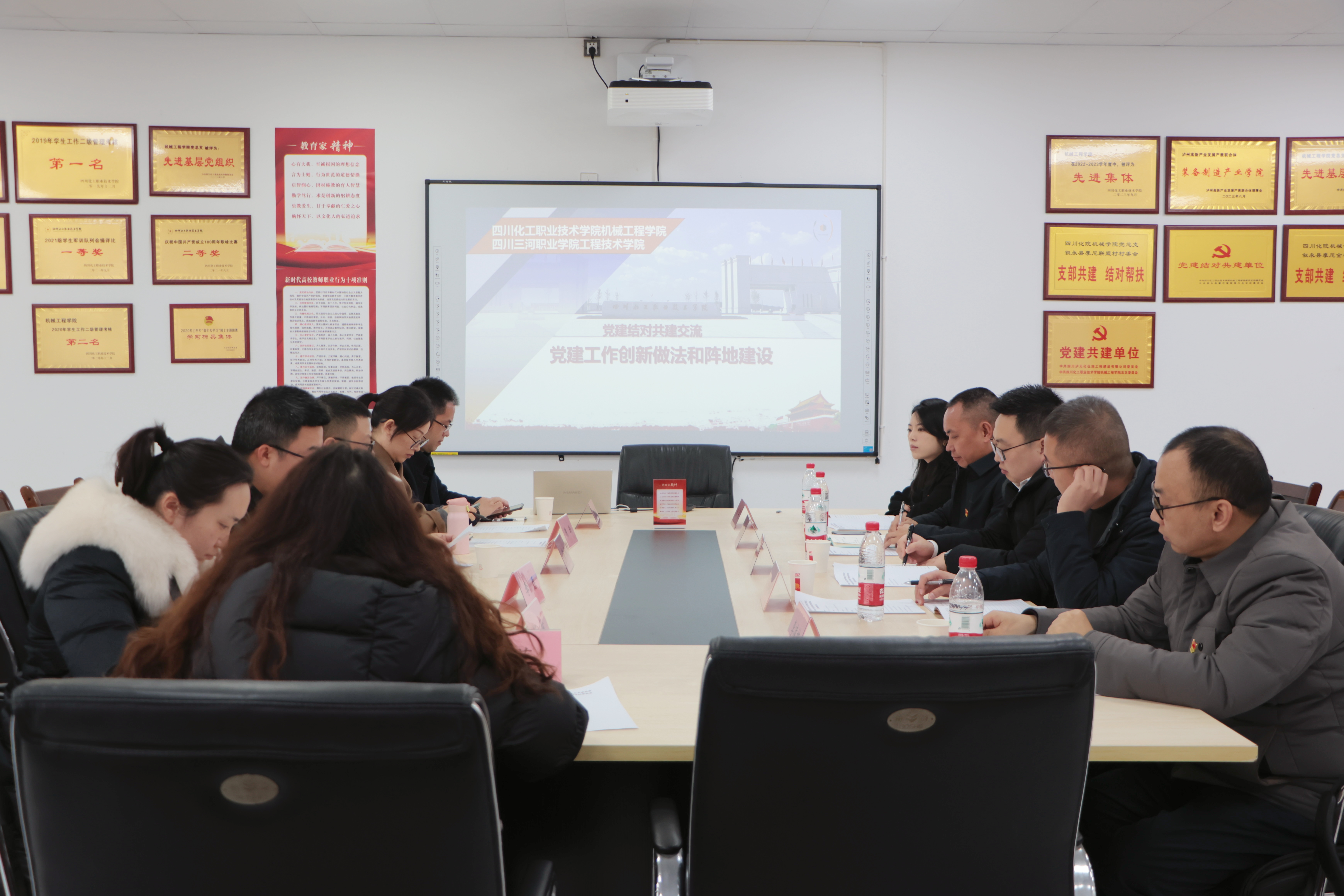 四川三河职业技术工程技术学院党总支书记周德湘、学院院长钱康亮、学生党支部书记兼学办主任孙鹏程、机械教研室主任李凌林、专职组织员龙芳与智能制造学院党总支书记银强、机械工程学院副院长陈玲、学生工作负责人彭成瑶、教学科长李磊、教师党支部书记漆翔、学生党支部书记邬玲、专职组织员谢萍在综合办公楼113室就党建工作创新做法和阵地建设、专业建设方面、毕业生实习就业等工作情况进行了交流。