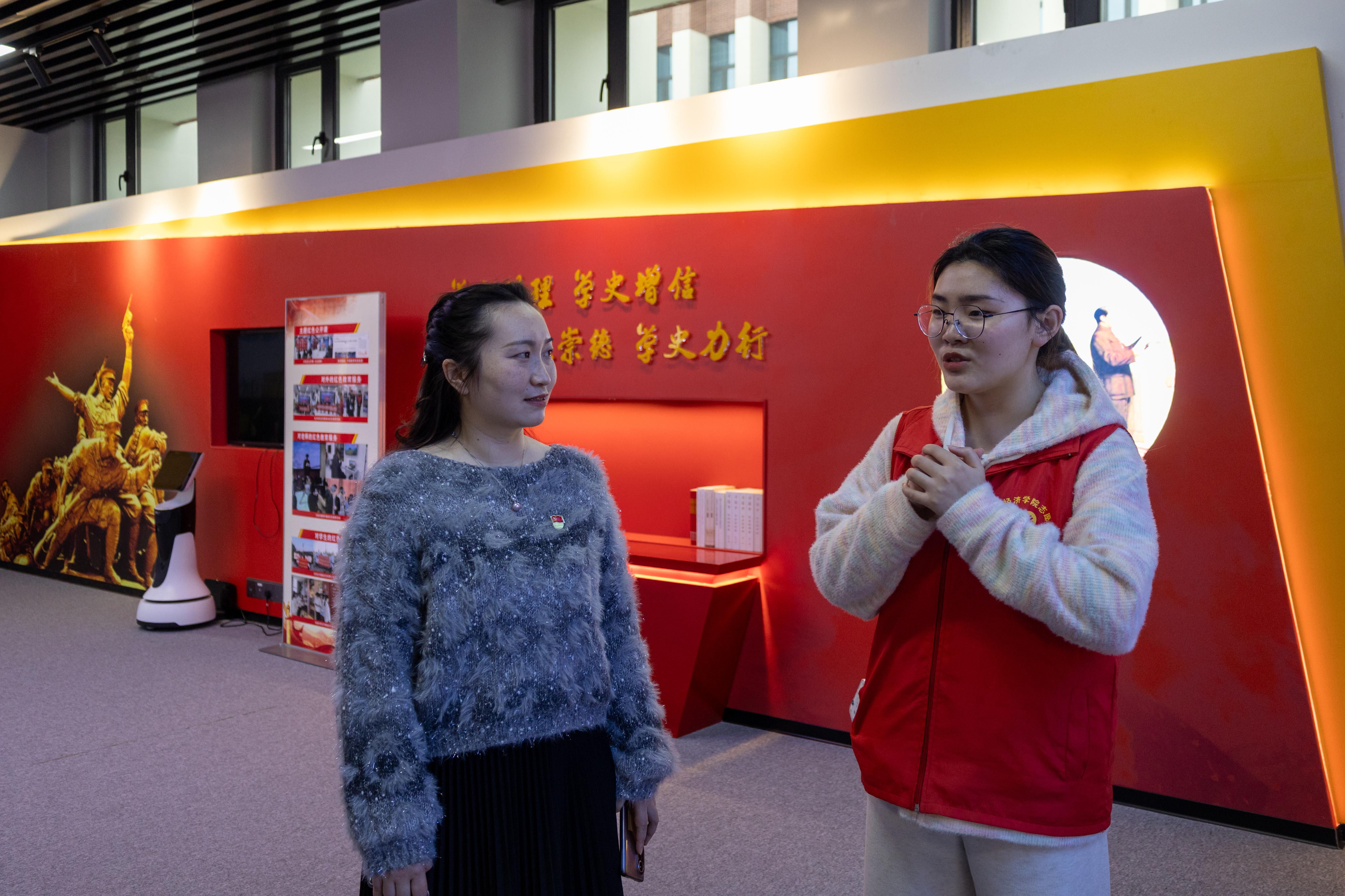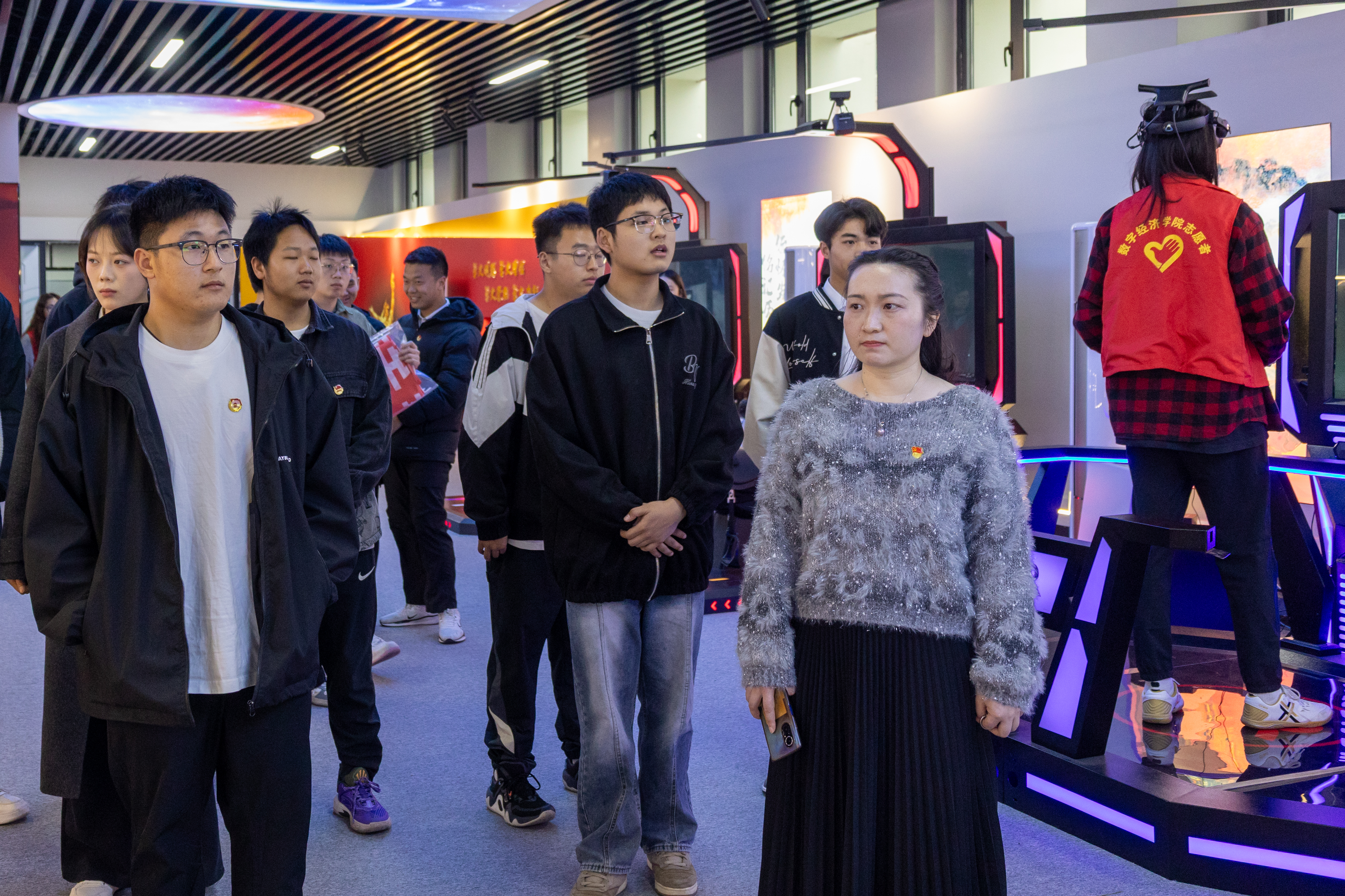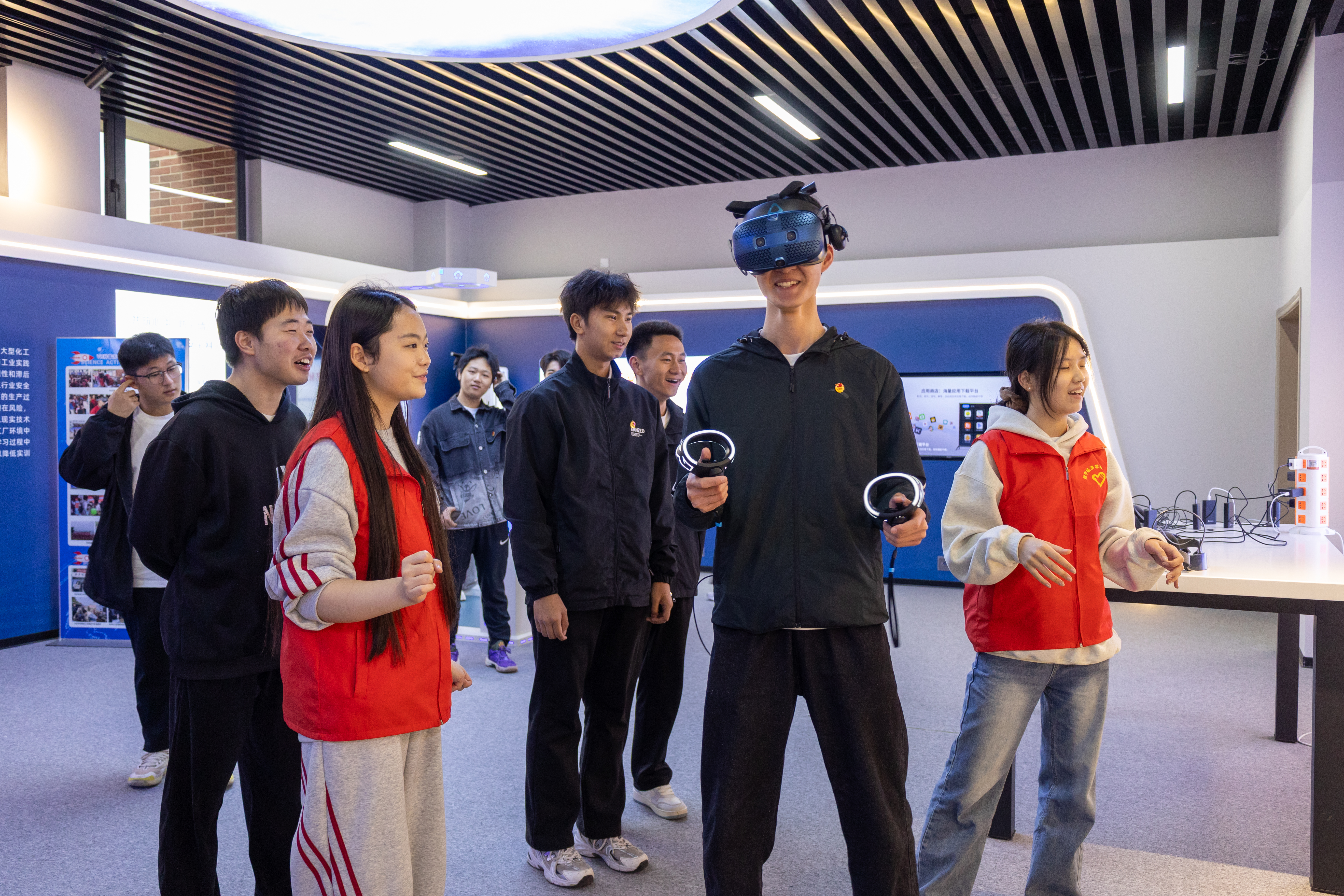 踏入虚拟仿真实训基地,同学们便被充满科技感的氛围所吸引。这里,红色文化与现代科技实现了深度融合。在志愿者的引导下,大家有序体验各类VR 设备。