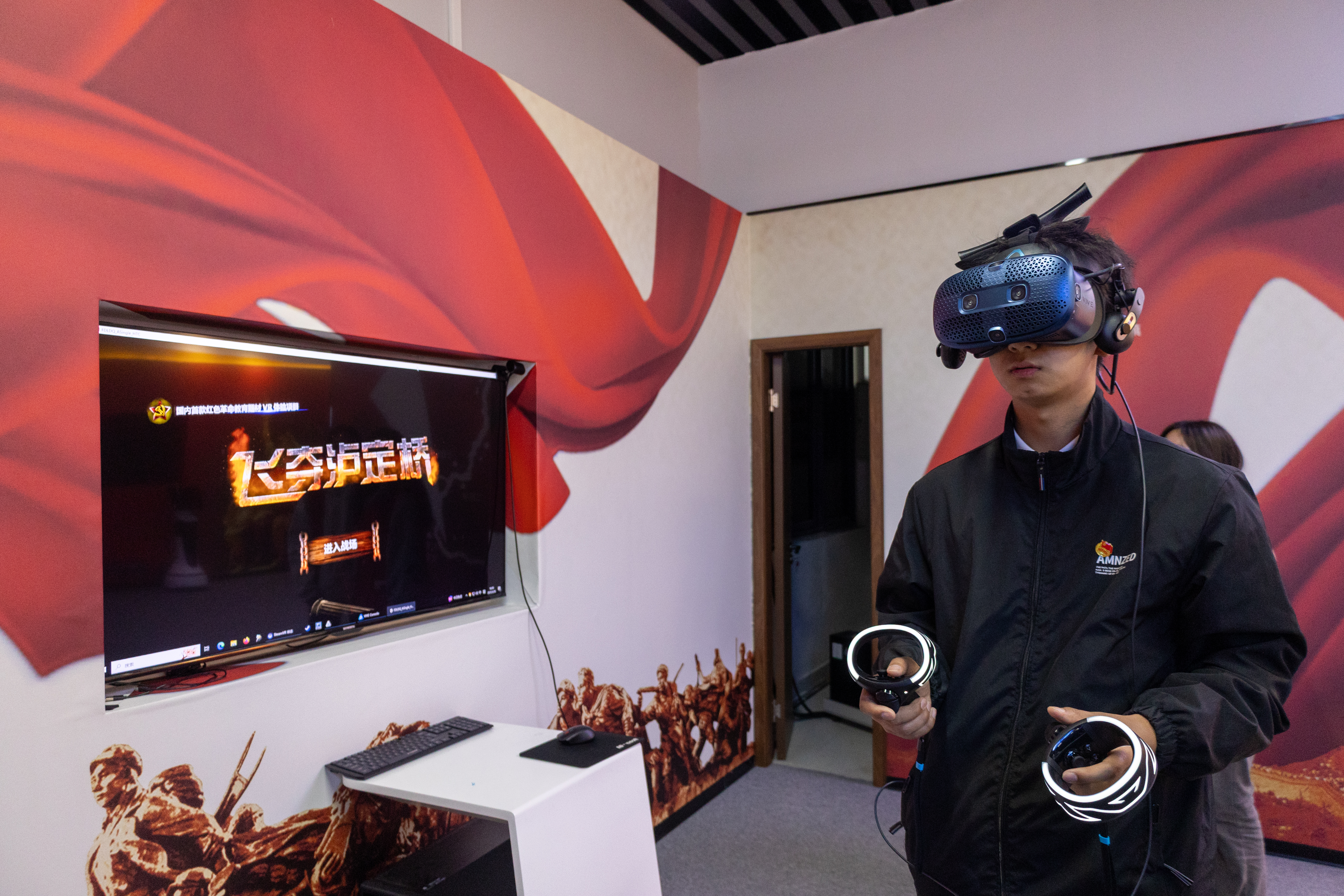 当戴上VR头盔的那一刻,仿佛时空交错,同学们瞬间“穿越”到了战火纷飞的革命年代。