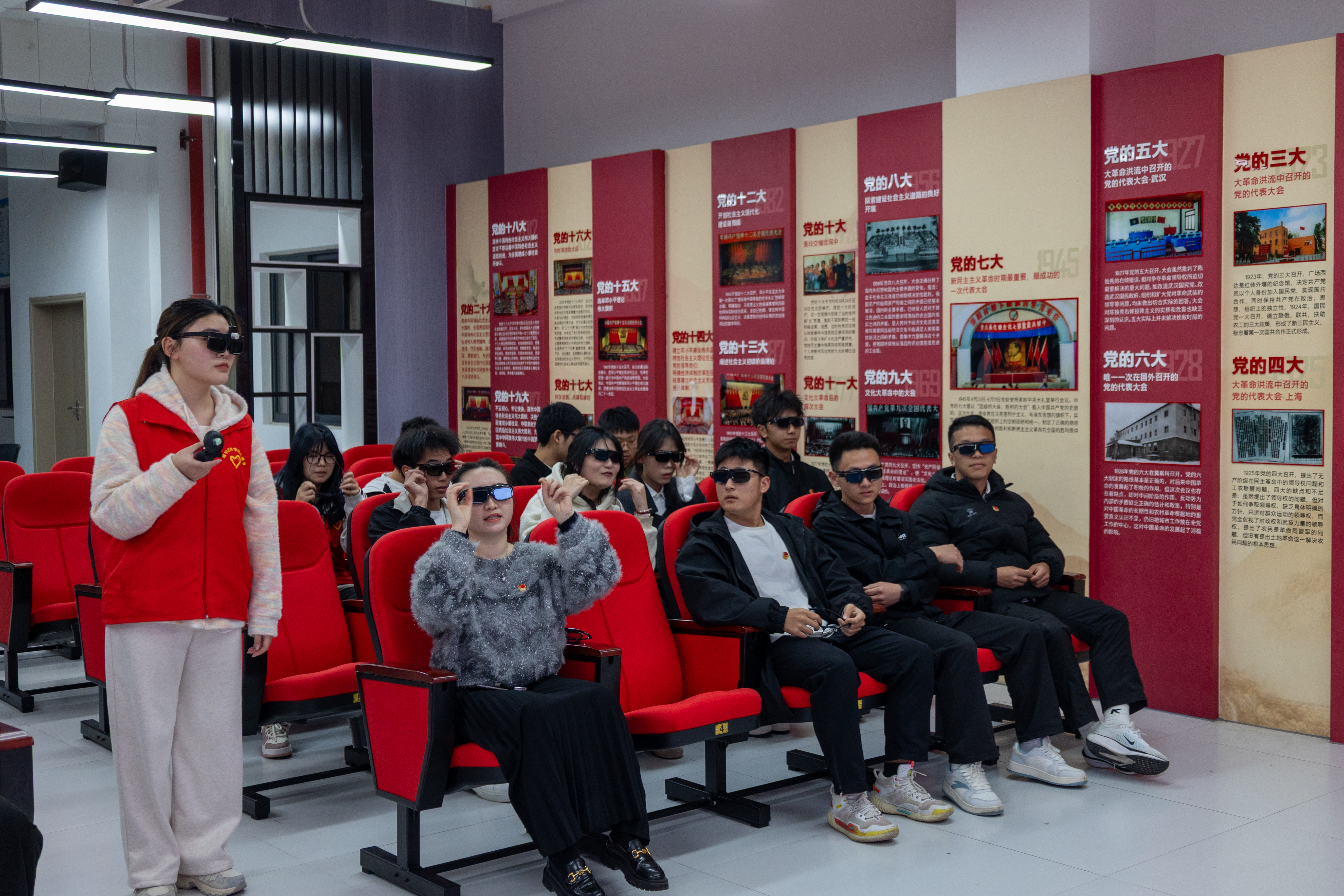 除了VR体验,同学们还参观了基地LED大屏3D展示区——红色博物馆。通过图文并茂的展板,大家重温了党的发展历程,深刻领会到党的每一次重大决策背后的智慧与担当。在互动体验区,党员们还利用数字技术参与红色知识问答、模拟历史场景决策等活动,进一步加深了对红色精神的理解。