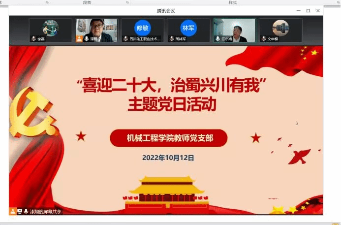 为迎接党的二十大胜利召开,机械工程学院教师党支部于10月12日组织召开了“喜迎二十大.治蜀兴川有我”主题党日活动,学校党委副书记、校长文申柳,机械工程学院党总支副书记、院长任小鸿,全体党员同志,入党积极分子,参加了此次活动,此次活动采用线上腾讯会议方式进行。