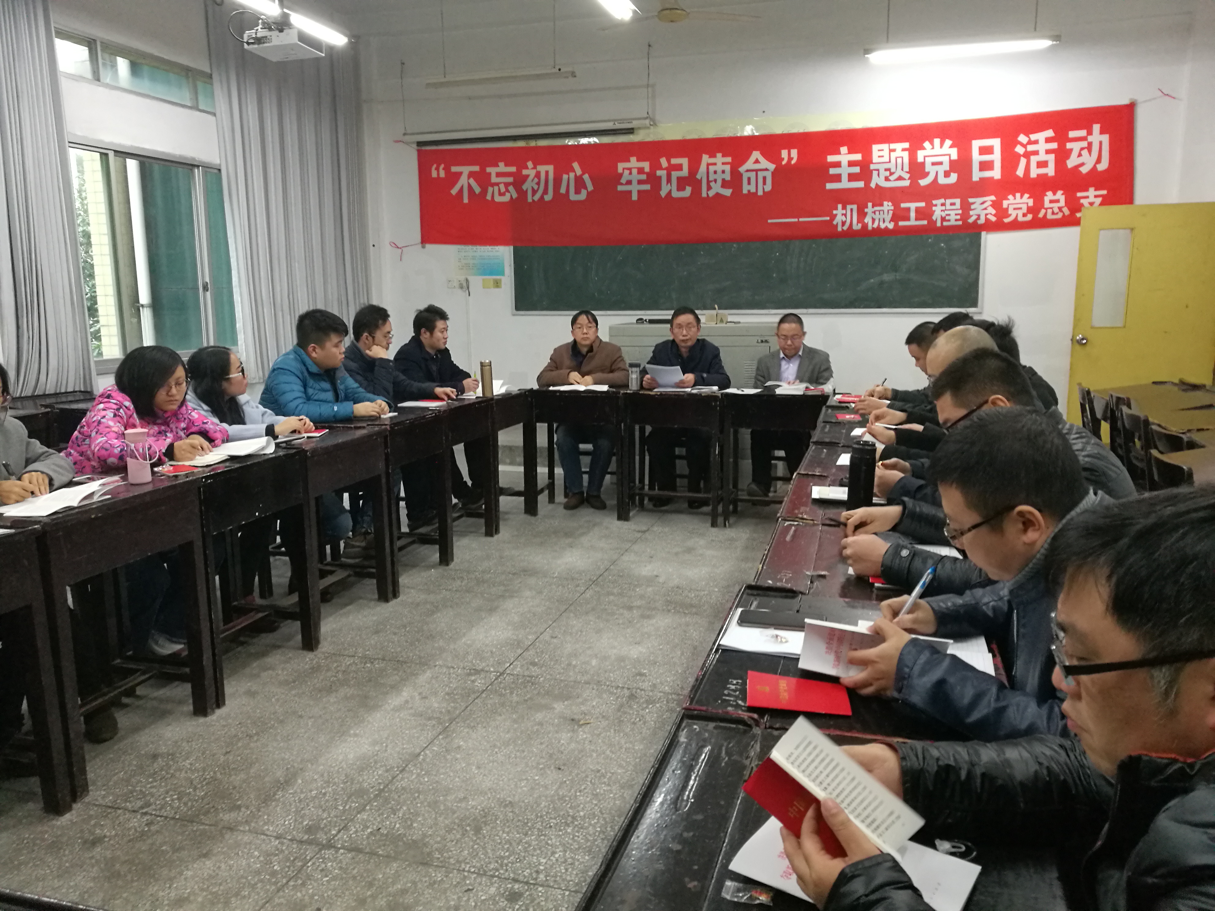 11月27日下午5点,机械工程系党总支在综合楼A401教室,组织开展“不忘初心、牢记使命”主题党日活动,机械工程系全体党员教职工和学生预备党员参加本次活动。