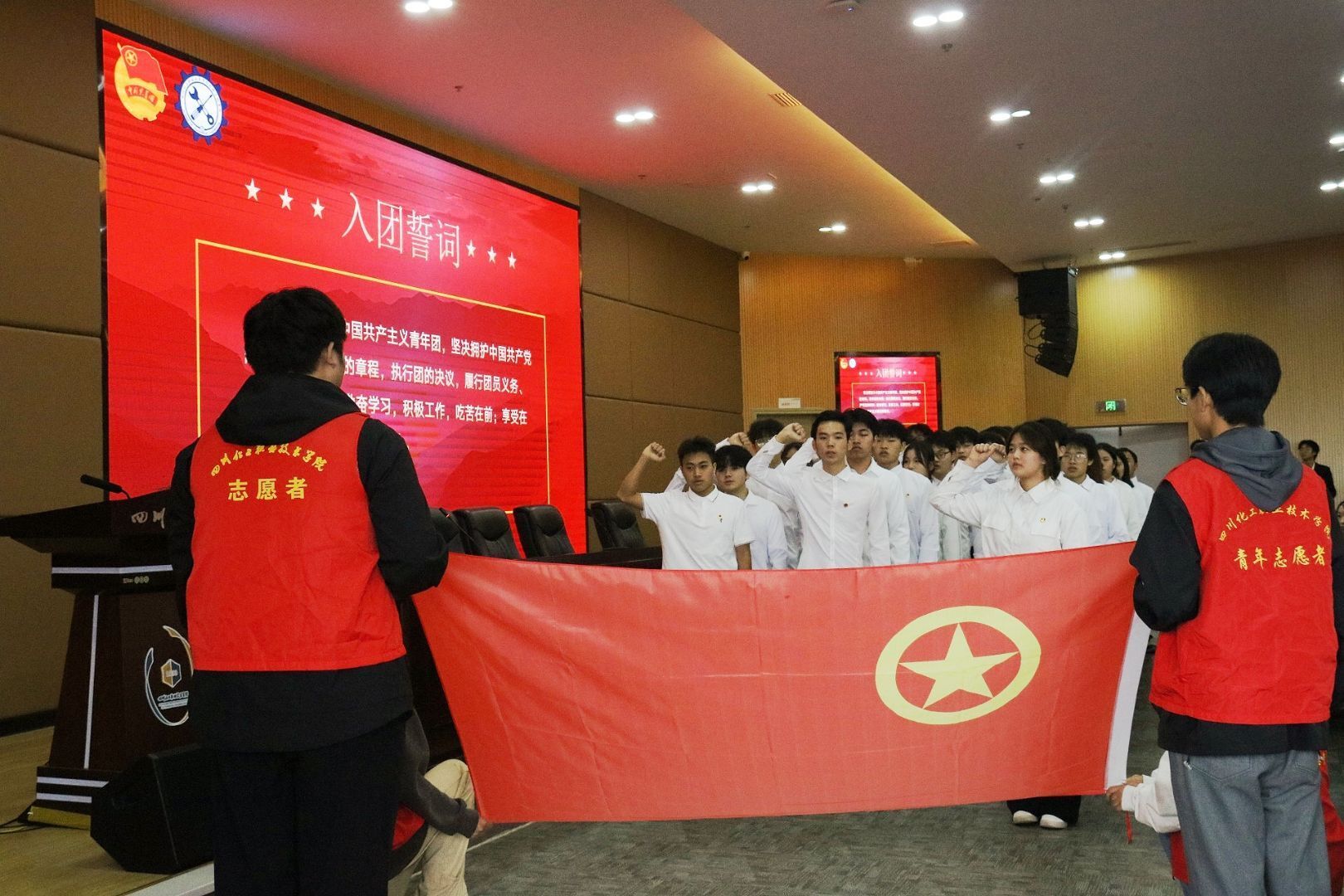 仪式在庄严的国歌声中拉开帷幕。随后,张雅镘宣读新团员名单,邬玲、唐力、张雅镘依次为新团员颁发团员证并佩戴团徽。洁白衬衫上,金色团徽熠熠生辉,既承载着荣誉,更寄托着沉甸甸的责任。