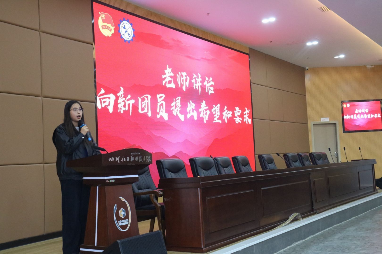 紧接着,在学院学生兼团总支副书记李小清的带领下,全体新团员高举右拳,面向共青团团旗庄严宣誓,铿锵有力的誓言在报告厅内久久回荡。宣誓结束后,新团员代表鲁应华发言,他表示将以入团为新起点,认真履行团员义务,以实际行动践行青春承诺。优秀团员代表张紫寒分享心得,她勉励全体团员以团员标准严格要求自己,锤炼品德、勤学善思,努力成长为合格的社会主义接班人。