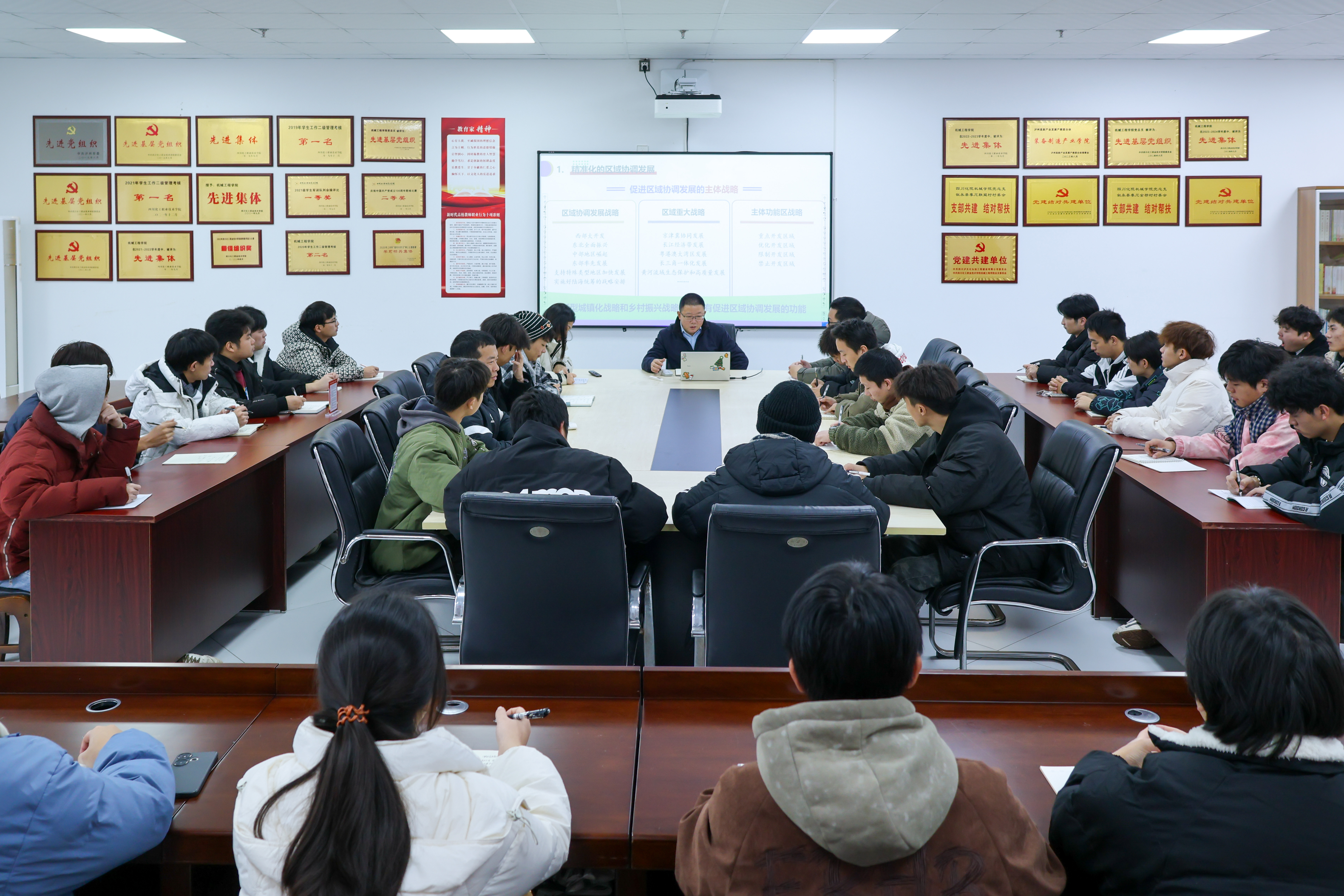 区域协调发展战略是重塑区域经济发展格局的重大战略,是解决区域发展不平衡不充分问题的有效方式,更是中国特色社会主义制度优越性的集中体现。大学生在区域发展中扮演着至关重要的角色,是新知识、新技术的接收者和传播者,更是区域创新的主体和未来发展的生力军。2024年12月25日,学校党委副书记、院长文申柳以“下好区域协调发展这盘棋”为主题,与同学们展开面对面交谈,为机械工程学院学生代表们上了一堂精彩生动的思政公开课。