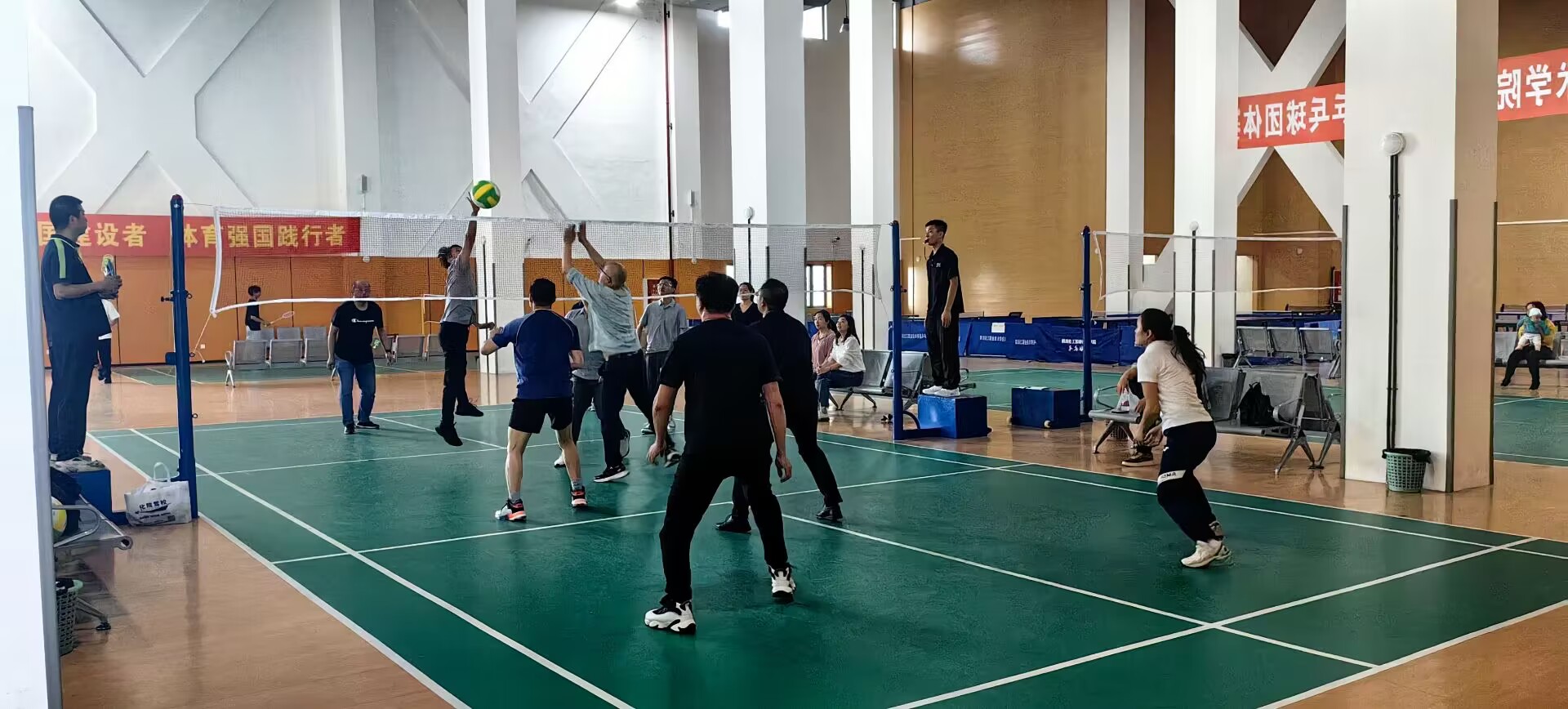 比赛中,运动员们满怀激情、全力以赴,一次次强劲有力地扣杀、一次次拼尽全力地防守、一次次恰到好处地配合......老师们充分发挥了气排球比赛的健身性、娱乐性和竞技性特点展现了高超的球技和团队协作精神。赛场外,各分会领队动态调整、战术指导,助威声、呐喊声此起彼伏,整个赛场充满了团结、友谊、和谐的气氛。