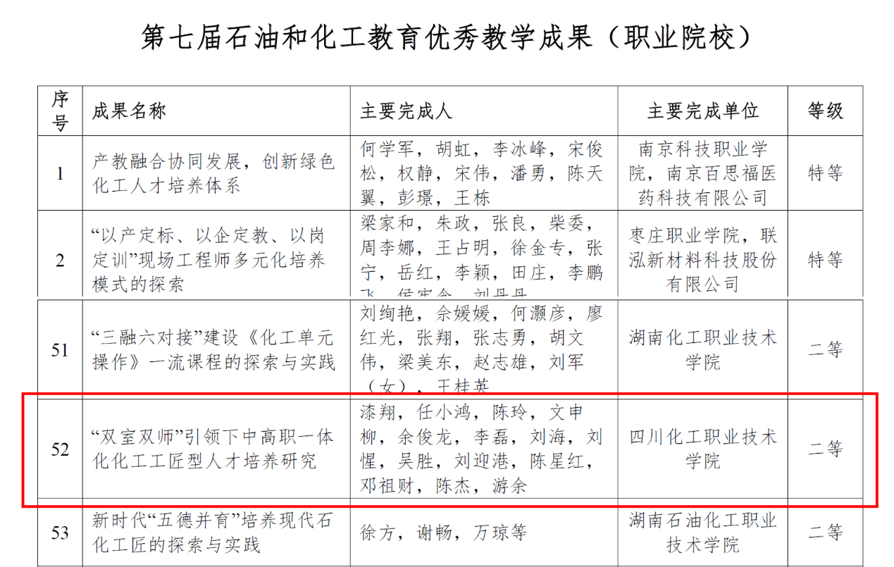 近日,中国化工教育协会发布了《关于第七届中国石油和化工教育教学成果认定结果的公示》(中化教协发〔2024〕52号),我院漆翔教师团队申报的教学成果“‘双室双师’引领下中高职一体化化工工匠型人才培养研究”荣获二等奖。这是我院继第六届中国石油和化工教育教学成果奖后再次获奖,充分展示了学院在化工职业教育领域的持续创新与成就,也彰显了我院在行业内的领先地位。