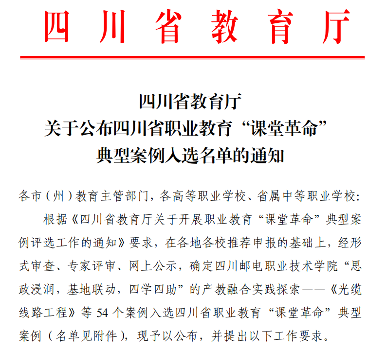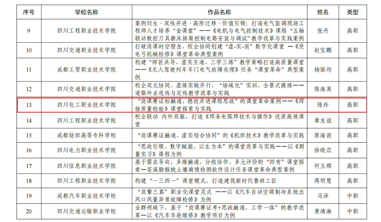 近日,四川省教育厅发布了《关于四川省职业教育“课堂革命”典型案例入选名单》,入选职业教育“课堂革命”典型案例54个。其中,我院陈玲教师团队《“岗课赛证标融通,德技并进课程思政”的课堂革命案例——《焊接质量检验》课堂探索与实践“课堂革命”典型案例》入选。