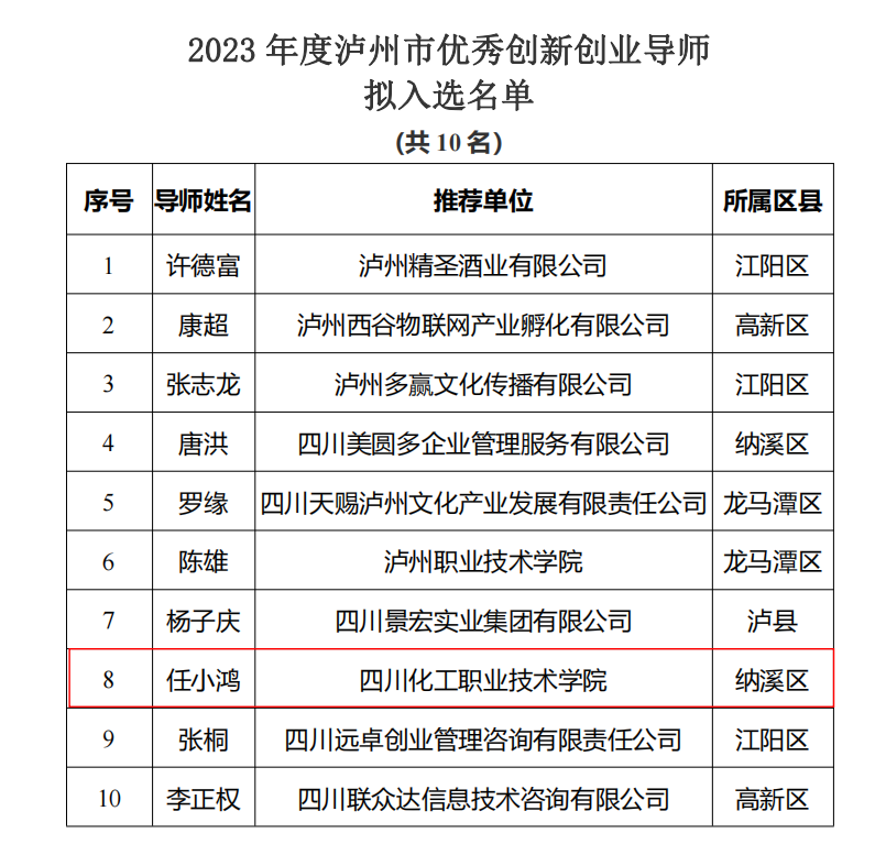 近日,泸州市科学技术和人才工作局公示了《2023年度泸州市优秀创新创业导师拟入选名单》。我院任小鸿拟入选2023年度泸州市优秀创新创业导师。