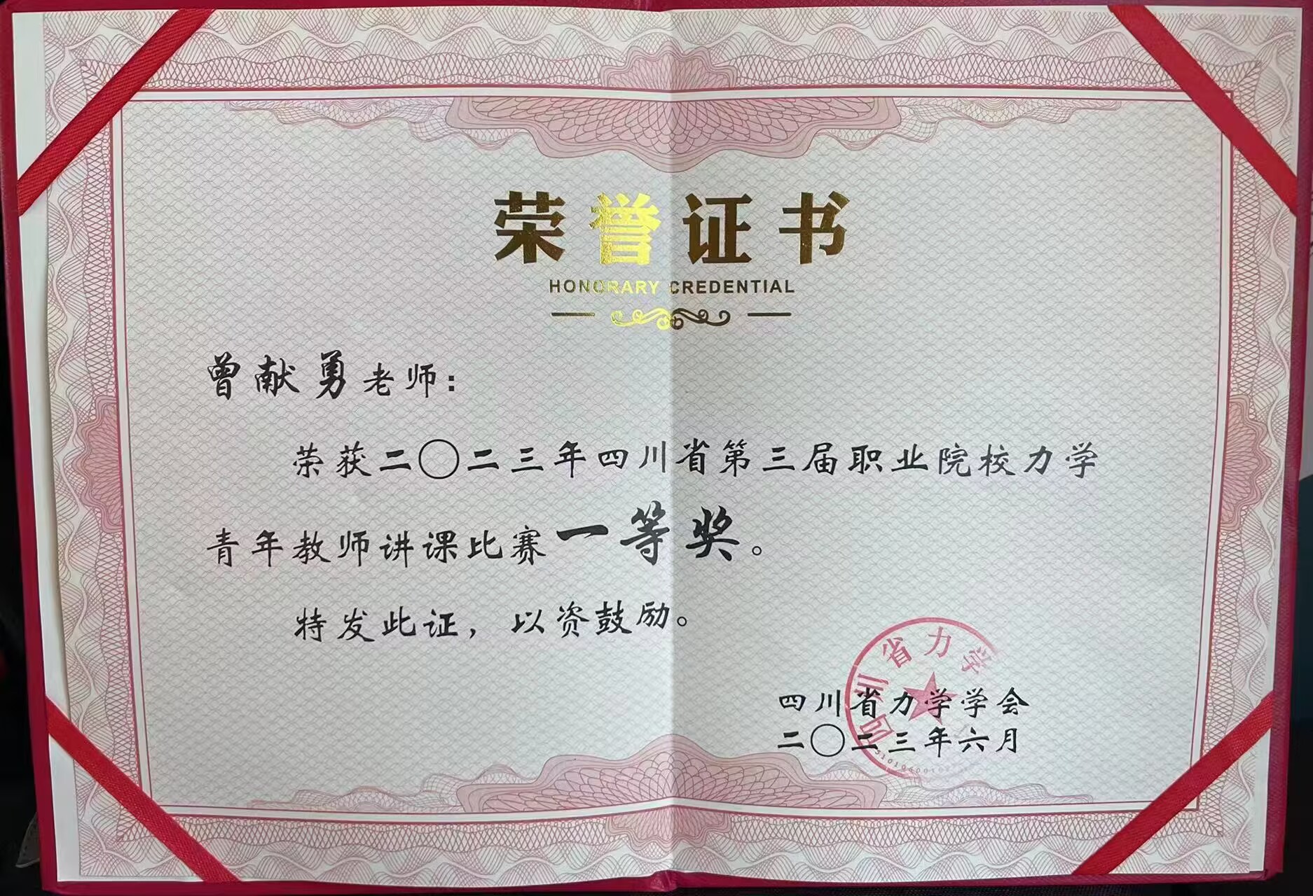 2023年6月9日-11日,由四川省力学学会主办的四川省第三届职业院校力学青年教师讲课比赛在四川建筑职业技术学院举行,来自全省约十所高职院校的二十余名青年教师参加了本次讲课比赛,我校机械工程学院郝红梅、曾献勇老师获得一等奖。
