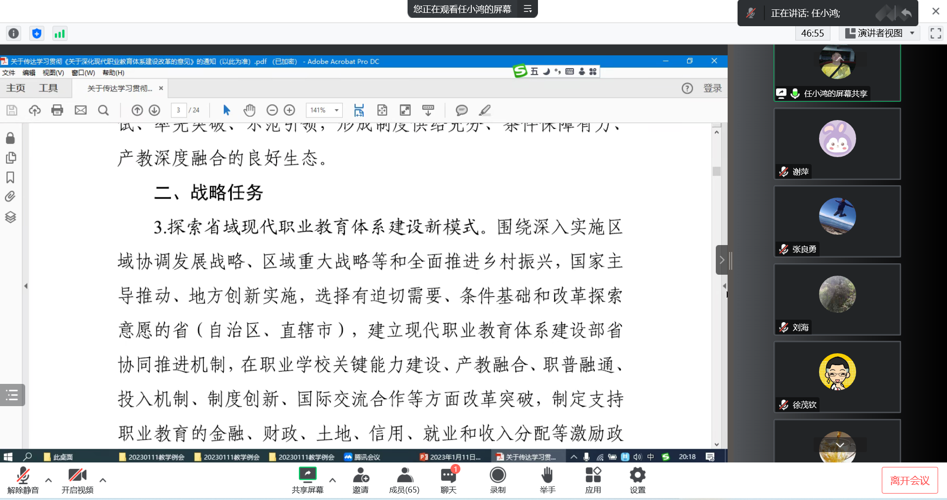 任小鸿领学《关于深化现代职业教育体系建设改革的意见》,从总体要求、战略任务、重点工作、组织实施四个方面14条具体内容进行了详细解读,要求结合陈子季司长在新闻发布会上总结的“1+3+3”系列重要论述(1个重大论断、3个重大战略举措、3个重要努力方向),充分认识职业教育的战略定位、实践要求和客观规律。提出了新阶段职业教育改革“一体、两翼、五重点”系列举措,即探索省域现代职业教育体系建设新模式,构建市域产教联合体和行业产教融合共同体,围绕职业教育自立自强设计的提升职业学校关键办学能力、加强“双师型”教师队伍建设、建设开放型区域产教融合实践中心、拓宽学生成长成才通道、创新国际交流与合作机制五项重点工作努力。