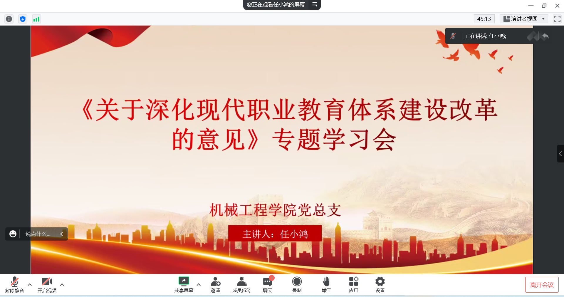 1月11日,机械工程学院党总支组织学习《关于深化现代职业教育体系建设改革的意见》,会议由党总支副书记任小鸿主持,学院全体教职工参加。本次会议通过线上腾讯会议形式进行。