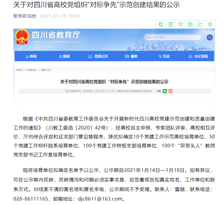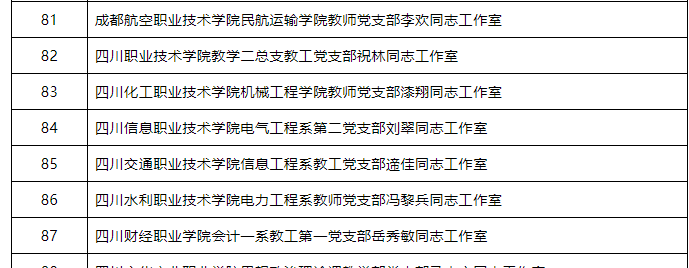 根据《中共四川省委教育工作委员会关于开展新时代四川高校党建示范创建和质量创建工作的通知》(川教工委函〔2020〕42号)的要求,在学校党委领导下,在学校组织部指导下,机械工程学院党总支高度重视,统筹协调,安排专人开展了前期申报工作。申报材料经高校自主申报、专家团队评审、高校相互评价、厅内综合评定和征求部门意见等程序,我院“四川化工职业技术学院机械工程学院教师党支部漆翔同志工作室”成功进入“全省高校‘双带头人’教师党支部书记工作室”培育公示名单中。