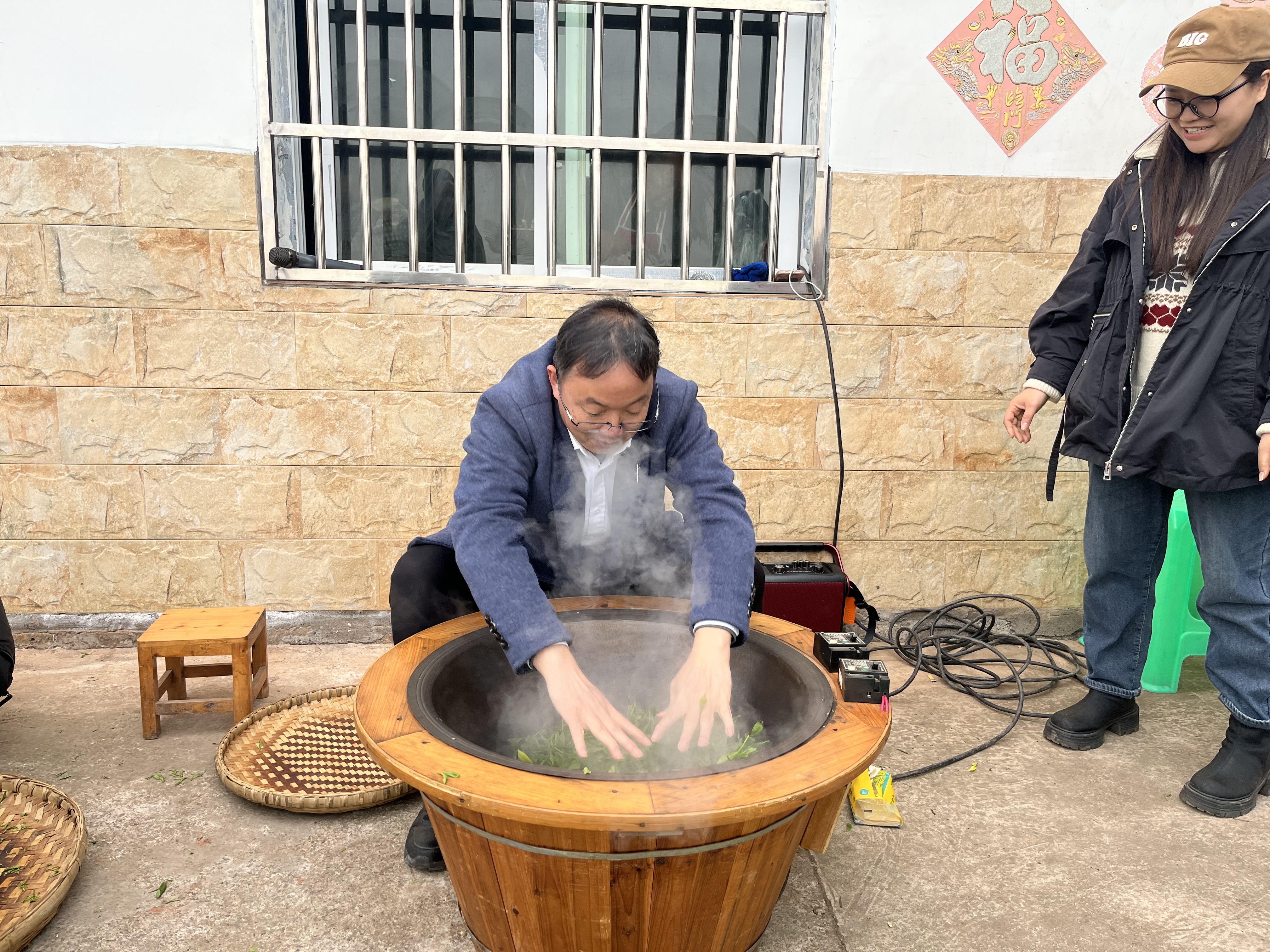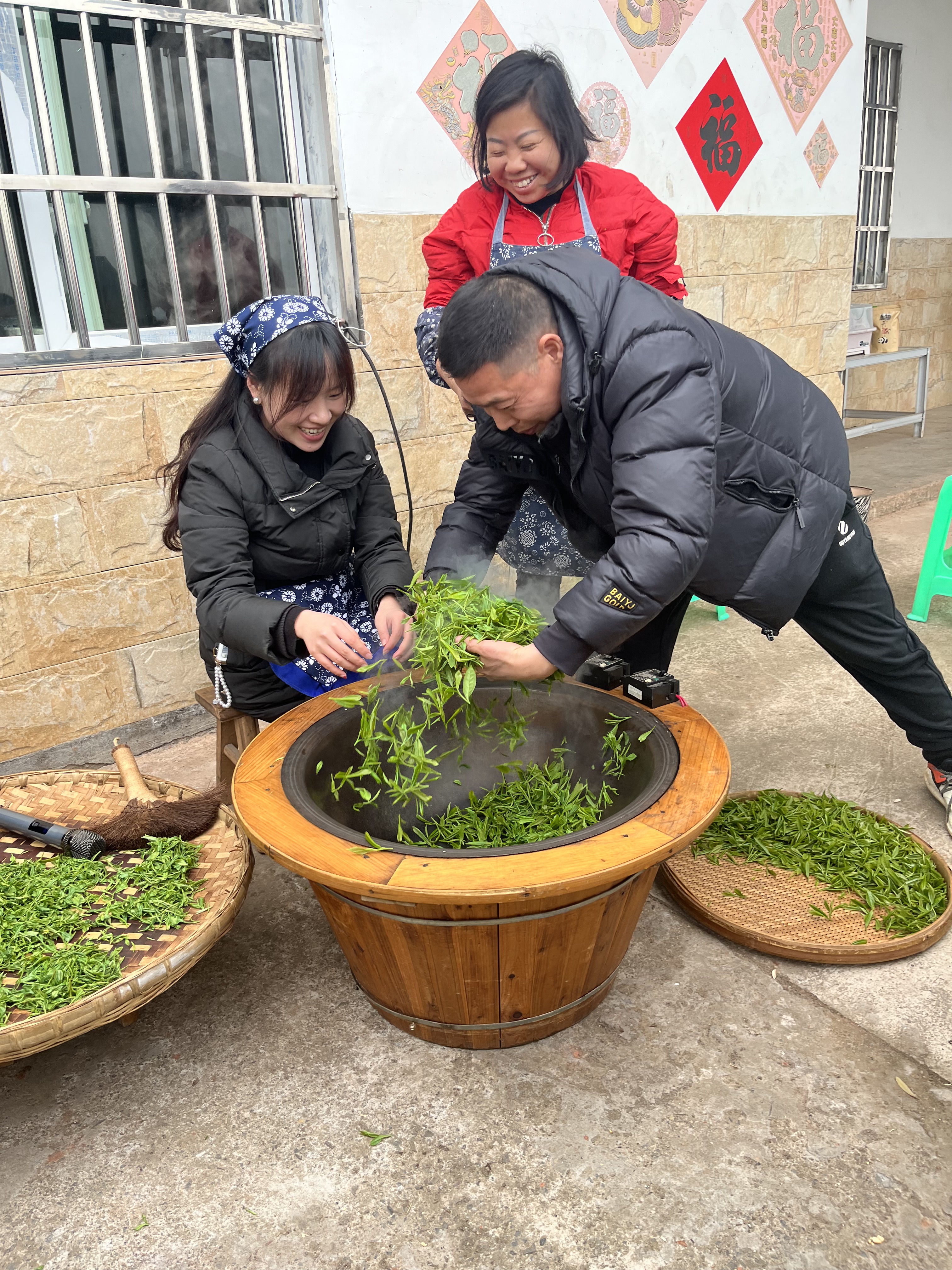 茶农把大家采摘下来的茶叶集中倒在大簸箕里摊晒,从“杀青”到“揉捻”,从“干燥”到“包装”,技术人员详细讲解每道工序的技术要点。部分老师动手参与揉捻环节,感受茶叶在掌间的微妙变化,领悟“匠心”在传统技艺中的价值和意义。